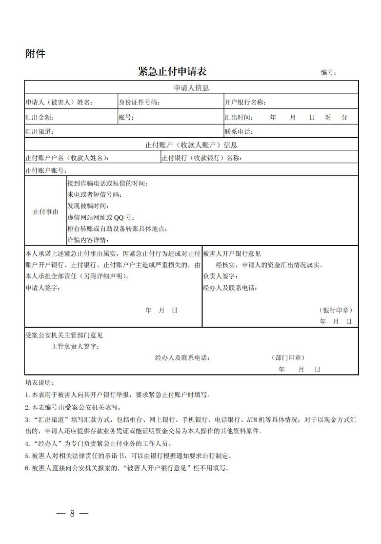二、规范紧急止付、快速冻结业务流程1.被害人申请紧急止付。被害人被骗后,可拨打报警电话(110),直接向公安机关报案;也可向开户行所在地同一法人银行的任一网点举报。涉案账户为支付账户的向公安机关报案。 被害人向银行举报的,应出示本人有效身份证件,填写《紧急止付申请表》(见附件),详细说明资金汇出账户、收款人开户行名称、收款人账户(以下简称止付账户)、汇出金额、汇出时间汇出渠道、疑似诈骗电话或短信内容等,承诺承担相关的法律责任并签名确认。同时,银行应当告知被害人拨打当地110报警电话。公安机关110报警服务台应立即指定辖区内的公安机关受理并告知被害人。被害人将110指定的受案公安机关名称告知银行,银行应当立即将《紧急止付申请表》以及被害人身份证件扫描件通过管理平台发送至受案公安机关